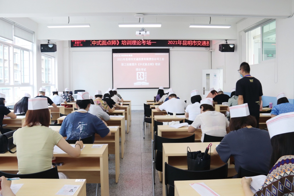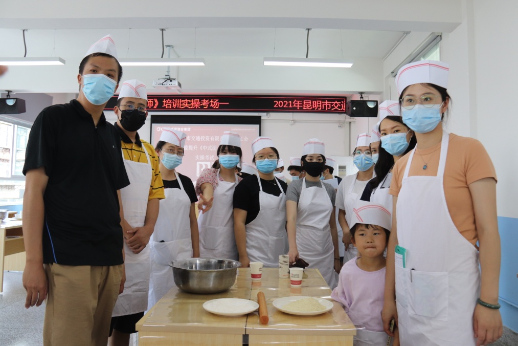 這里是8月7日昆明交投公司中西式面點師職工技能考試現場,身穿職場工裝的學員穿上了圍裙和佩戴面點師帽子,依次走進考場在課桌前緩緩坐下,跟隨著授課教師的復習性講解,“為粉料加調料、和面、揉面、搓條、下劑、制皮、上餡、成型、熟制裝盤”等每個所學動作在腦中一一浮現。最終,在嚴謹而有序的考試氛圍中,4個班190 名學員面向考官完成了實操和理論兩個環節的考試,順利通過考核并獲得相應職業資格證書。