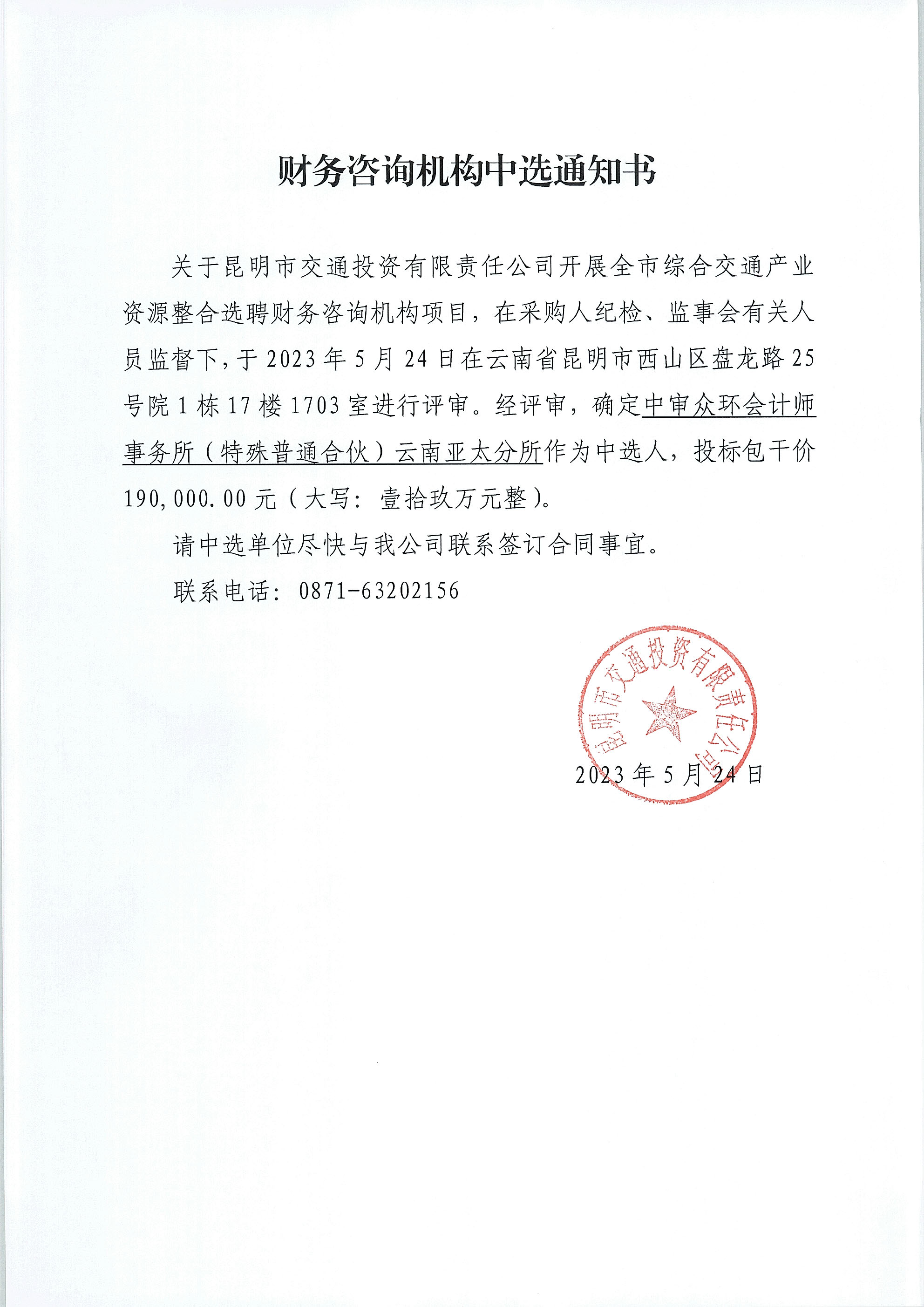 財務咨詢機構中選通知書