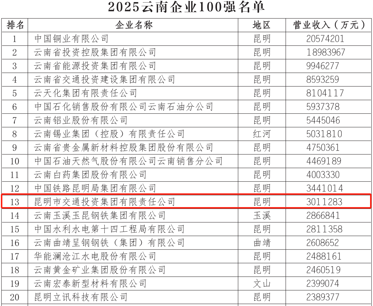 2025年12月6日,云南省企業(yè)聯(lián)合會(huì)、云南省企業(yè)家協(xié)會(huì)正式揭曉2025年“云南企業(yè)100強(qiáng)”及“云南服務(wù)業(yè)企業(yè)50強(qiáng)”榜單。昆明交投集團(tuán)在“云南企業(yè)100強(qiáng)”中榮列第13位,在“云南服務(wù)業(yè)企業(yè)50強(qiáng)”中,也取得第7名的優(yōu)異成績(jī)。